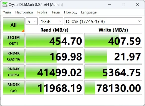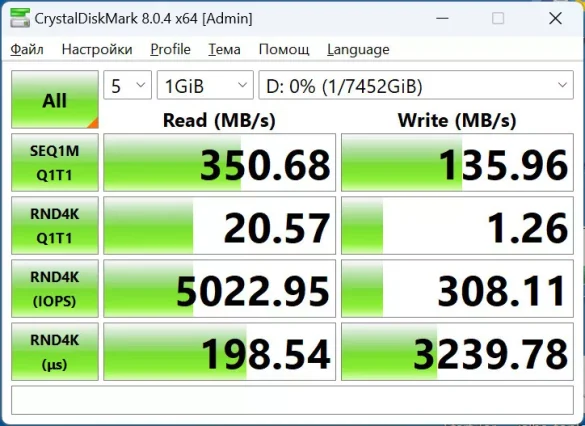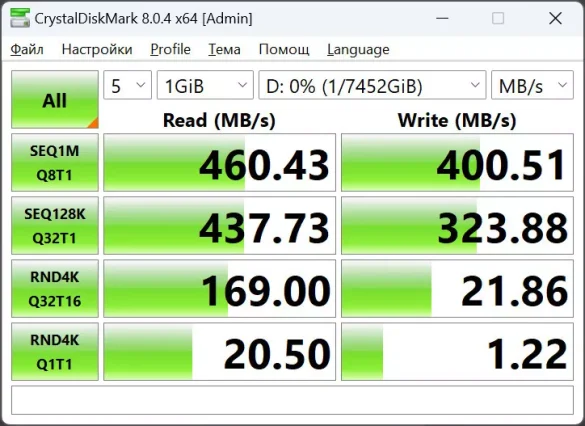 С този USB 3.2 Gen 1 интерфейс въпросният модел, който имахме възможност да тестваме, не може да бъде кой знае колко бърз в писането на данни и в четенето им. Параметрите му включват скорости до 460 MBps.