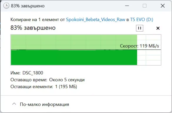 Интересното е, че при действителна задача със записване на 1 GB видео, макар скоростта да е по-малка, се наблюдава изключителна стабилност на скоростта на записа. Няма пикове и спадове – видеото се записва равномерно бързо върху носителя от началото до края.