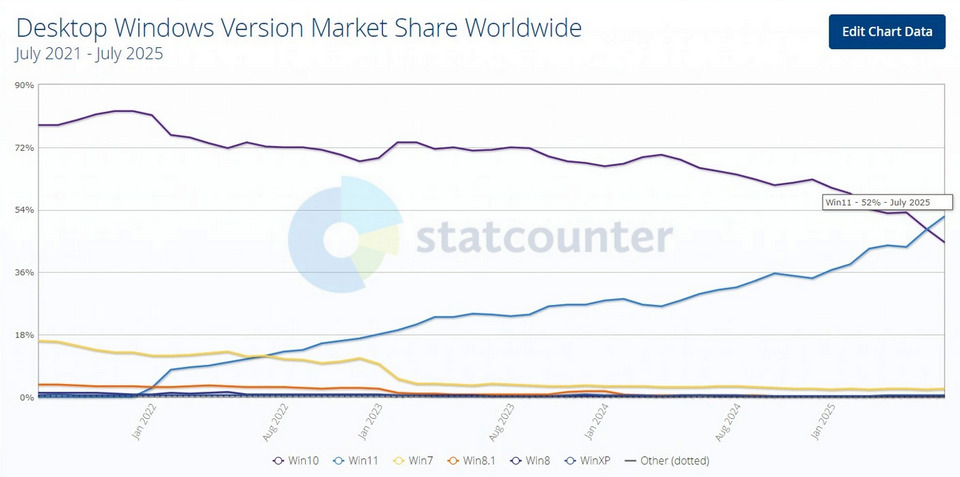 За първи път в своята история Windows 11 стана доминираща операционна система на пазара на персонални компютри: делът ѝ през юли достигна 52%, докато Windows 10 се сви до 44,59%, по данни на StatCounter.