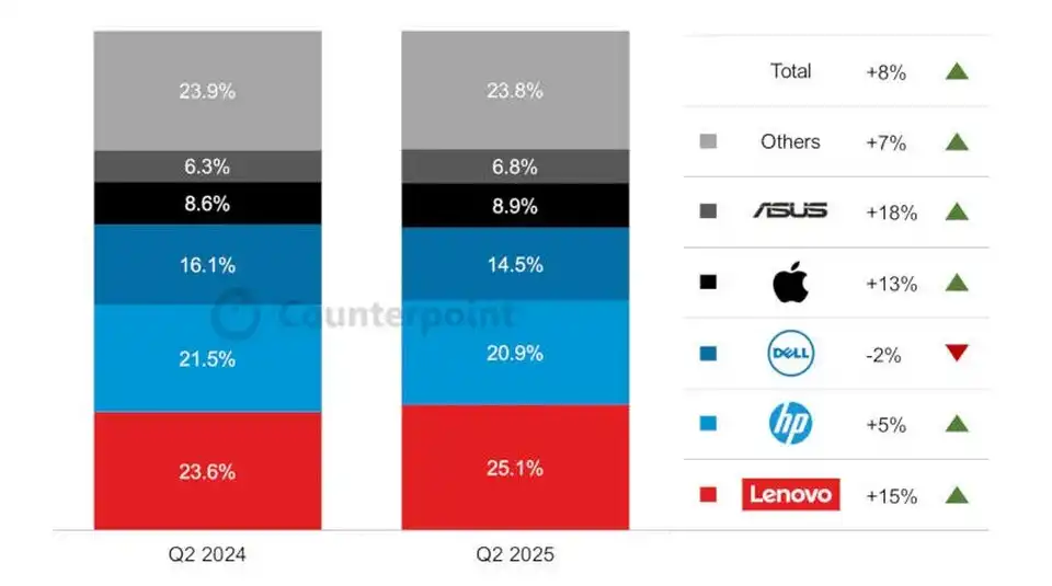 Според резултатите от второто тримесечие на 2025 г., компютрите на Lenovo заемат малко над една четвърт от всички доставени РС в света – делът на компанията достига 25,1%, в сравнение с 23,6% година по-рано.