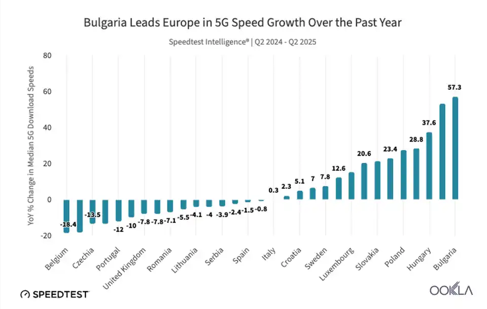 Средните скорости за изтегляне през 5G в България са се увеличили с над 57% на годишна база, достигайки 324,09 Mbps през второто тримесечие на 2025 г., въз основа на анализ на данните на Speedtest Intelligence на Ookla. Това е най-бързият темп на растеж на скоростта в Европа.