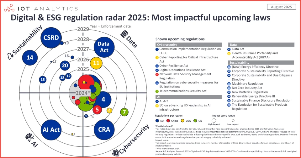 Данните дойдоха от новия доклад „Перспективи за дигиталните и ESG регулациите 2025–2030“ на IoT Analytics. Анализаторската формация оцени всички 41 регламента, като определи на всеки от тях оценка за въздействие въз основа на три основни измерения: броя на засегнатите организации, тежестта на санкциите за неспазване и разходите за прилагане.