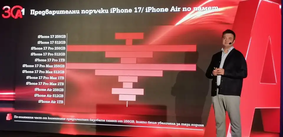 Според данните за предварителните поръчки, най-търсени са моделите с 256 GB памет, а най-предпочитан е моделът iPhone 17 Pro Max. За първи път в портфолиото на световния производител се предлагат телефони с 2 ТВ памет. Въпреки големия интерес към iPhone Air, той остава на трето място като избор и се доближава по  резултати по-скоро към iPhone 17, показват данните на А1.