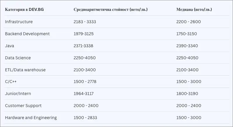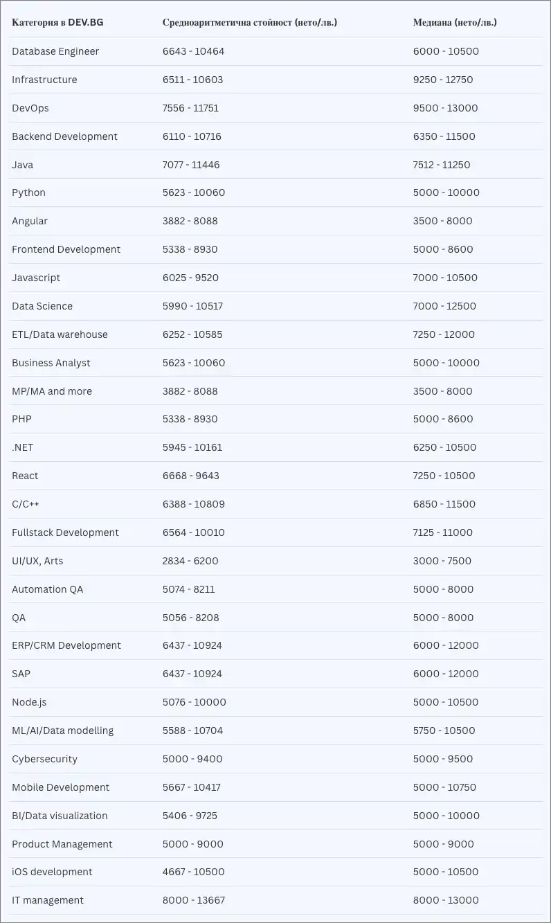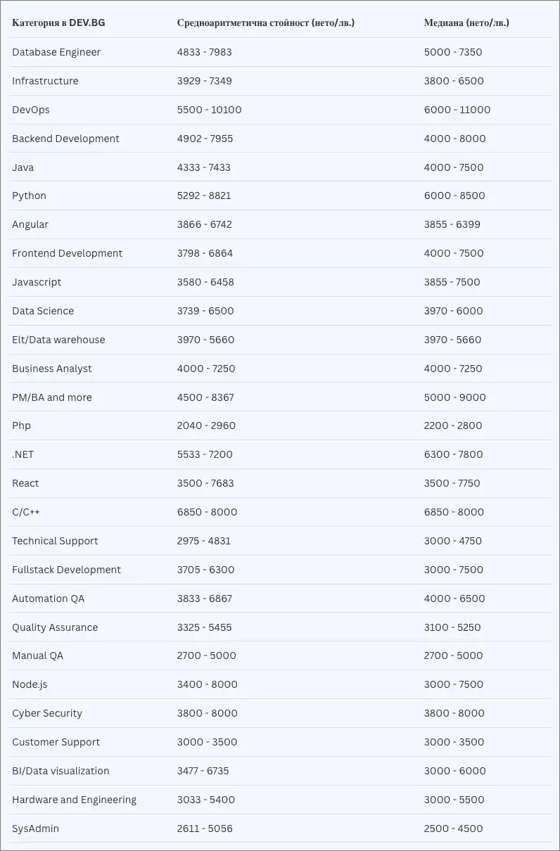 През 2024 г. средноаритметично DevOps са получавали 4874-8371 лева, докато през настоящата достигат 5500-10 100 лева. Повишението при Python е от 4563-7252 лева и медиана 5000-8000 лева през 2024 г., до 5292-8821 лева и медиана 6000-8500 лева за 2025 г.