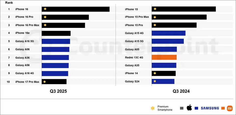 И накрая, челната десетка затваря отново Apple с iPhone 17 Pro Max, което е впечатляващо, като се има предвид, че продажбите на този модел започнаха едва в началото на третото тримесечие.
