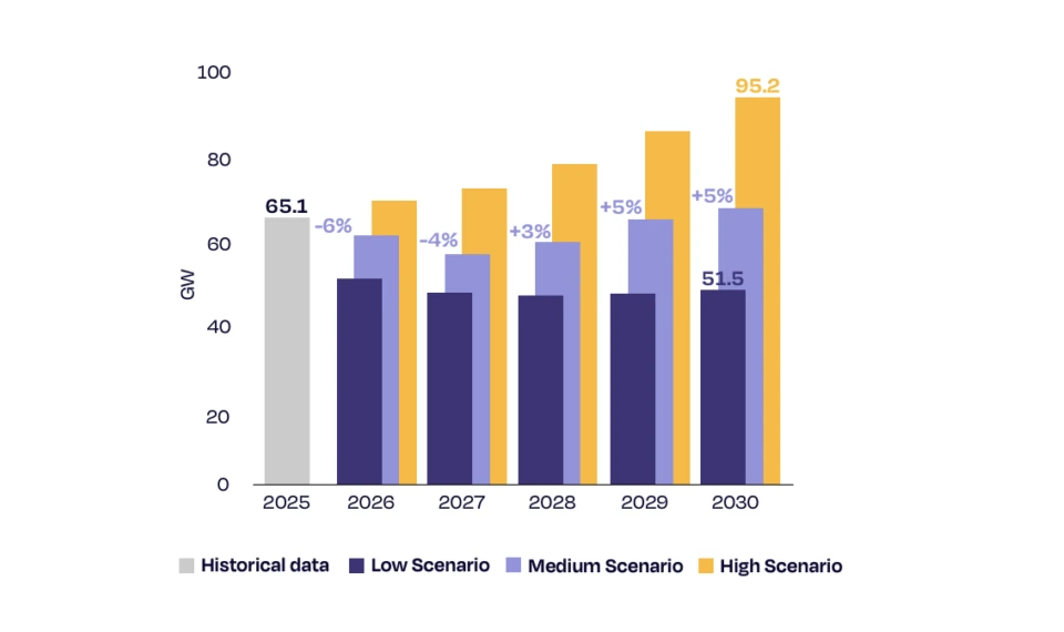 След това се очаква инсталациите на годишна база да започнат да се покачват отново, фактори за което ще са възходът в съхранението на енергия, гъвкавостта, електрификацията и подобряването на рамковите условия. Все пак прогнозите сочат, че индустрията ще надмине резултата от тази година едва през 2030 г., когато „средният“ сценарий предполага да бъдат добавени почти 68 GW.