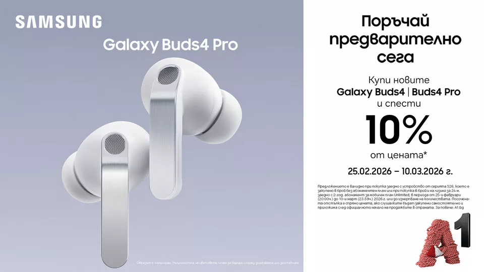 При заявяване на смартфон от серията Galaxy S26 клиентите могат да вземат и новите безжични слушалки Galaxy Buds4 или Galaxy Buds4 Pro с 10% отстъпка. Поръчките могат да бъдат направени лесно и удобно онлайн на a1.bg.