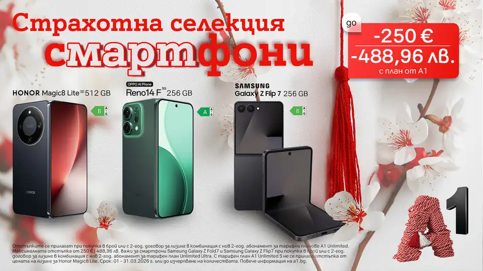 Пълната мартенска селекция смартфони с отстъпка до 250 евро/488,96 лв. можете да разгледате онлайн на a1.bg.