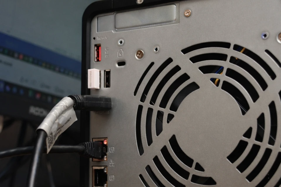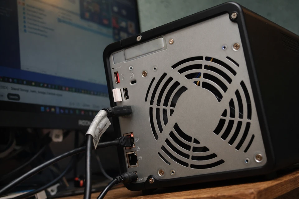 Този малък домашен NAS може да „раздава“ и поглъща съдържание с чудовищни скорости. На гърба му ще намерим два порта за мрежа на 2,5 Gbps – това е мрежова връзка, която е 2,5 пъти по-бърза от стандартната 1 Gbps връзка. Обикновеният домашен интернет или рутер често работи на 1 Gbps, но в случая имаме по-висок капацитет.