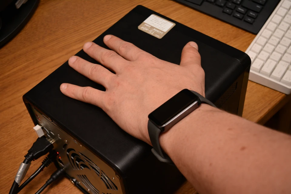 Физически корпусът на QNAP TS-464 е компактен – 16 см широк, 22 см дълбок, ако поставим ръка върху кутията, диагоналът ѝ е приблизително една педя:
