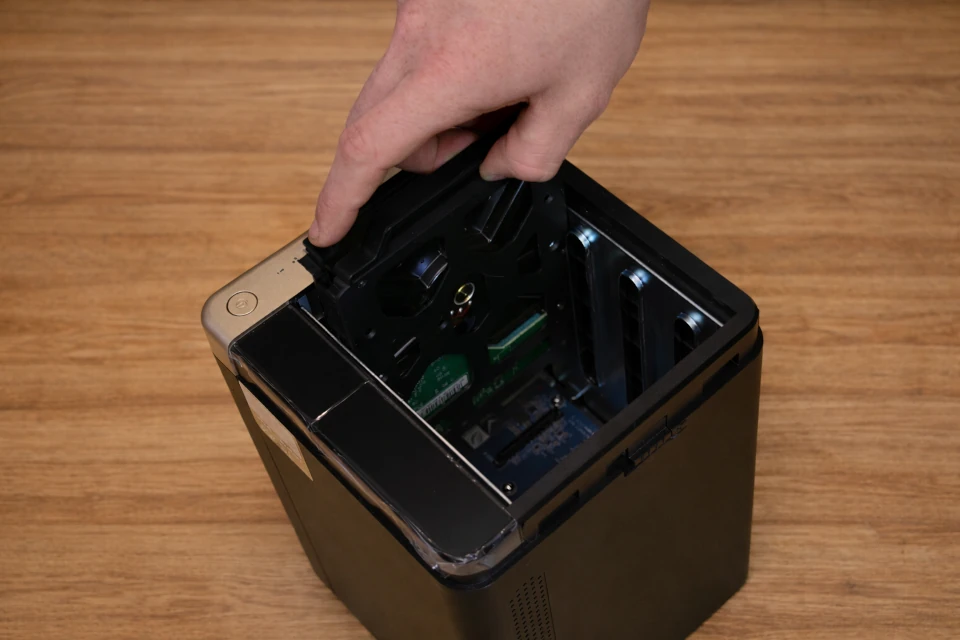 Вътре можем да наредим четири 3,5-инчови твърди диска (общо до 88 TB с днешните 22 TB дискове) и два твърдотелни: