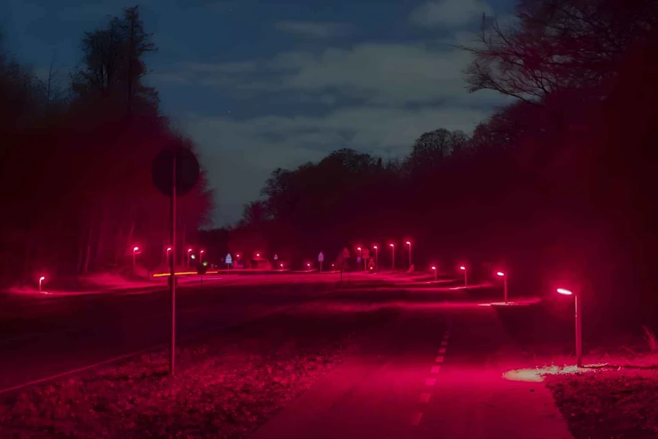 Участък от пътя Фредериксборгвей, разположен в периферията на Копенхаген, вече не е осветен с традиционните бели LED лампи. Те са заменени с червени светодиоди, които обагрят пътното платно и околната растителност в равномерна, но приглушена светлина.